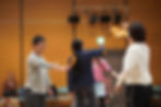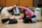 次にペアで向かい合い、てをあわせて落ち葉が落ちていく様子を表現しました。ゆっくり動いたり、伸びたり、小さくなったり…。「ひらひら」「パラパラ」と静けさの中にも温かさが広がっていました。